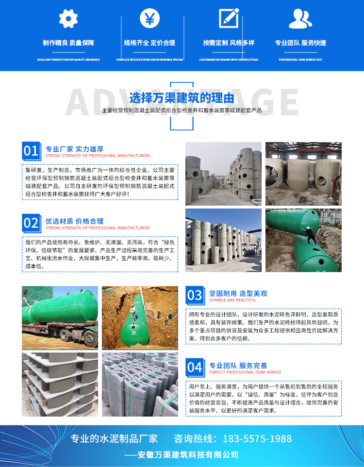 安徽萬渠建筑科技有限公司是集研發(fā),生產(chǎn)制造,市場推廣為一體的綜合性企業(yè)。公司主要經(jīng)營環(huán)保型預(yù)制鋼筋混凝土裝配式組合型檢查井和蓄水裝置等城建配套產(chǎn)品。產(chǎn)品生產(chǎn)過程采用獨(dú)特的生產(chǎn)工藝,機(jī)械化流水作業(yè)。產(chǎn)品大規(guī)模生產(chǎn),生產(chǎn)效率高,耗能少,成本低,產(chǎn)品使用壽命長、免維護(hù)、無滲漏、無污染,符合“綠色環(huán)保,低碳節(jié)能”的發(fā)展要求,是傳統(tǒng)磚砌井池的理想替代產(chǎn)品。